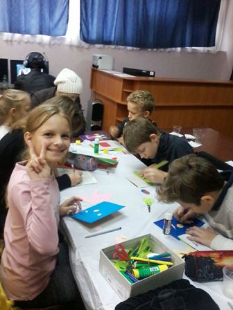 Творча частина заняття була проведена за принципом арт-терапевтичної методики – діти власноруч змайстрували декілька святкових листівок. В хід пішли різнокольорові олівці, фломастери, клей, яскравий папір для аплікацій – за допомогою них малеча за короткий проміжок часу встигла реалізувати свої творчі задумки в реальному житті.