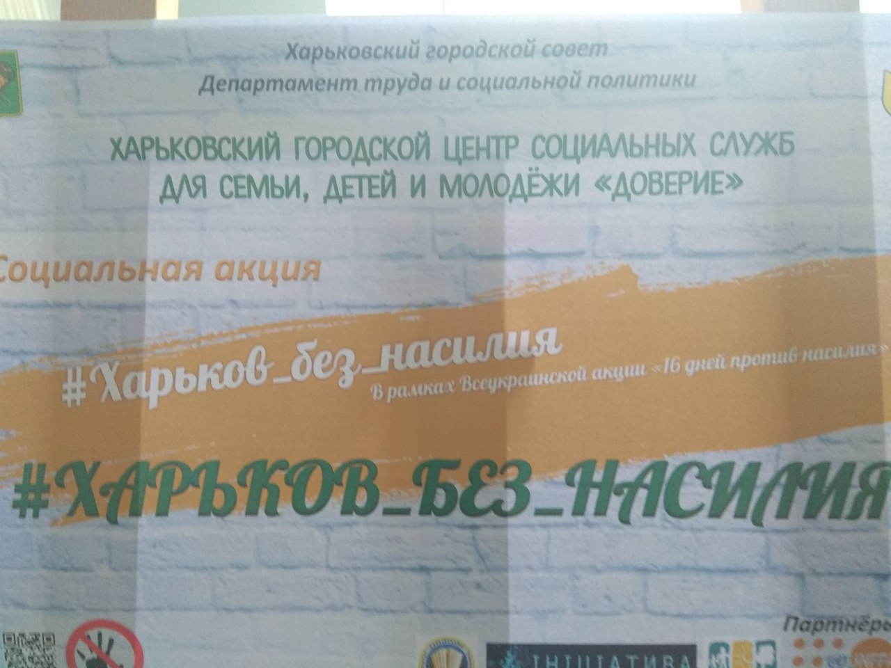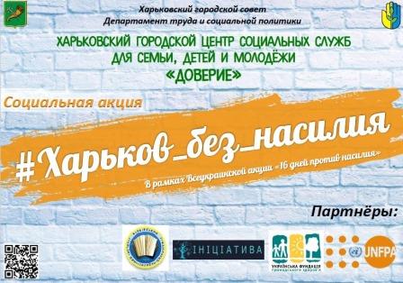 За підтримки Департаменту праці та соціальної політики Харківської міської ради Харківським міським центр соціальних служб для сім’ї, дітей та молоді «Довіра» 29 листопада 2017 року на базі Харківської гуманітарно-педагогічно академії було проведено загальноміську соціальну акцію «#Харьков_без_насилия» в рамках Всеукраїнської акції «16 днів проти насильства».